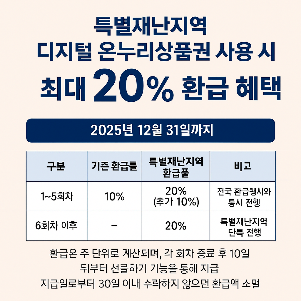 정부는 특별재난지역 49곳의 전통시장과 골목상점가에서 디지털 온누리상품권을 사용하면 최대 20% 환급 혜택을 제공하는 소비 촉진 행사를 2025년 12월 31일까지 진행합니다.