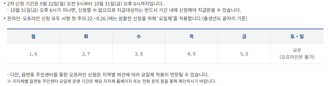 | 요일제 적용 | 첫 주(9/22~9/26): 출생년도 끝자리 기준 요일제 적용 (오프라인/방문 신청 시) 지역별 주민센터는 사정에 따라 연장 가능 |