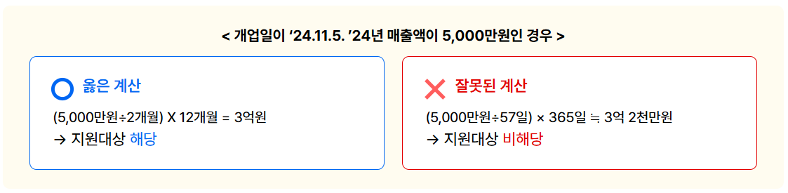 • ’24년(’24.1.1~12.31) 및 ’25년(’25.1.1~4.30) 개업 소상공인 : 개업 이후 월 평균 매출액을 연 환산*