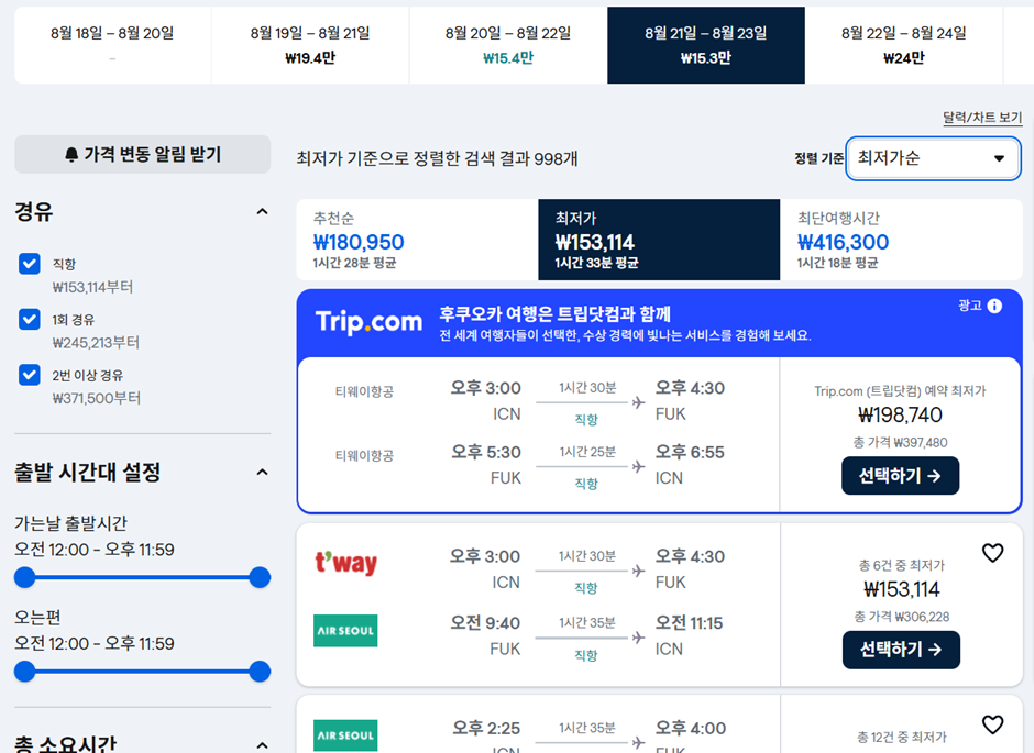 후쿠오카 여행의 첫걸음은 항공권입니다. 8월말은 일본 여행 성수기가 막 끝나가는 시점이라 가격대가 다소 안정적인 편이었어요. 김해공항에서 후쿠오카까지 비행 시간은 약 1시간 10분, 인천공항에서는 약 1시간 30분 정도 소요됩니다.